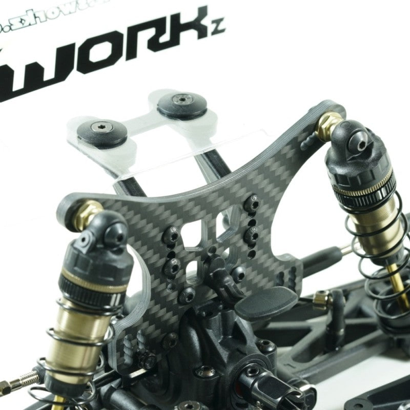 The S14-4C comes with SWORKz brand new designed 1/10 Pro-Shock System (Short version). The shocks come with new Emulsion Precision Plastic Shock Caps, Shock Pistons with Seal Parts. The kit comes standard with a 4mm carbon carpet version for both front rear shock towers. The Teflon coated shock shafts provides smooth shock reactions. Black Line springs which are good designed with rotation fixed spring holders comes standard in the SWORKz S114-4C kit.