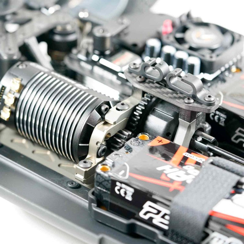 The S35-4e EVO features a T7075 hard anodized and lightened aluminium chassis with a new short wheel base design, that was tested for a long time by our factory pilots to guarantee the best speed balance for both front and rear suspensions. The standard HET differentials are included and provide High Density Motor Pinion Gear system as options.